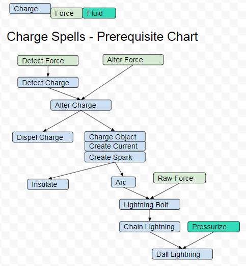 Causes a charge to build up in a small area, so that a spark is discharged. Works best on pointy objects of any material. Sparks can be used to ignite highly combustible objects such as tinder or flammable gasses and liquids. A spark cast onto an opponent provides a shock but does no damage.
