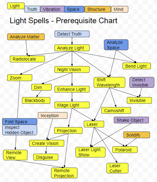 Shifts wavelengths away from visible spectrum into both infrared and ultraviolet, leaving only little mid-length (green/yellow spectrum) remainder. Can be cast on or around an object or area. If cast on a person or group of people, they become very difficult to see, requiring a perception roll at difficulty 30 for stationary objects, or 15 for moving objects.